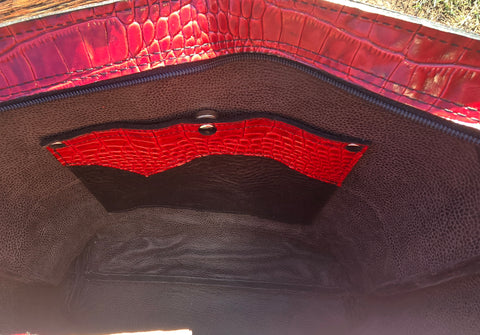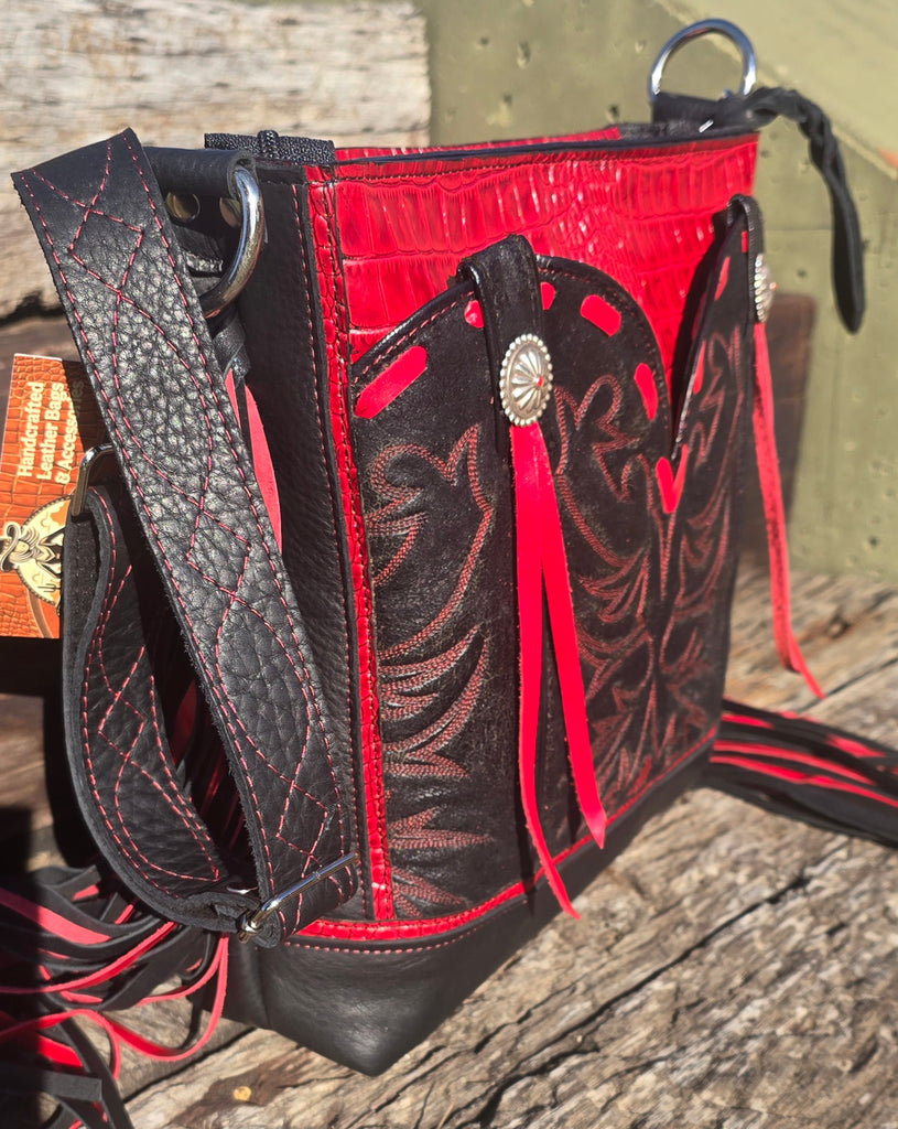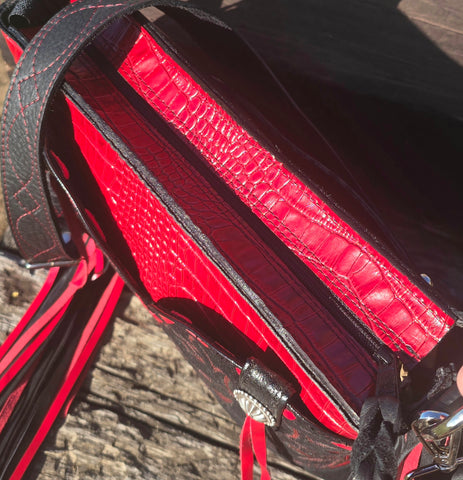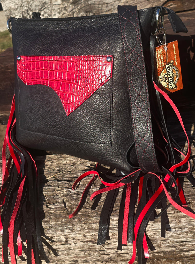 This Sally Bag is Bold, handcrafted, and built for the cowgirl who commands attention. This all-leather purse features a distressed black tooled boot-top that is a full front pocket, striking red croc-embossed leather trim, and silver concho accents. 14" Long layers of red-and-black fringe bring movement and attitude — the perfect mix of Western grit and glam. Made by hand, made to turn heads.