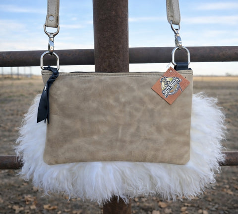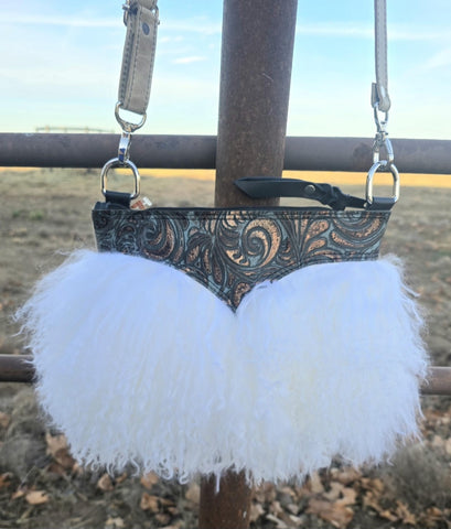 This one-of-a-kind Salty Sallys purse blends bold Western charm with high-end texture. The top panel features embossed turquoise-and-copper swirl leather, while the bottom half explodes with luxuriously soft white Tibetan lamb for a stunning statement piece. Finished with sturdy silver hardware and an adjustable strap, it’s the perfect mix of cowgirl glam and boutique elegance—eye-catching, fluffy, and totally unforgettable.