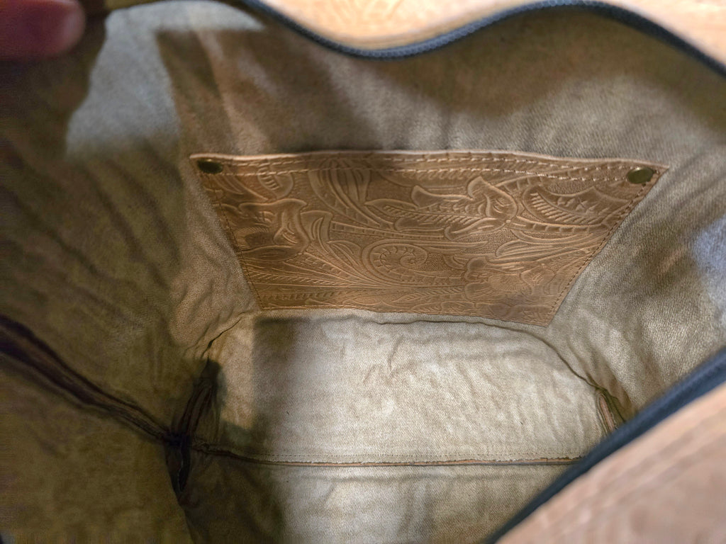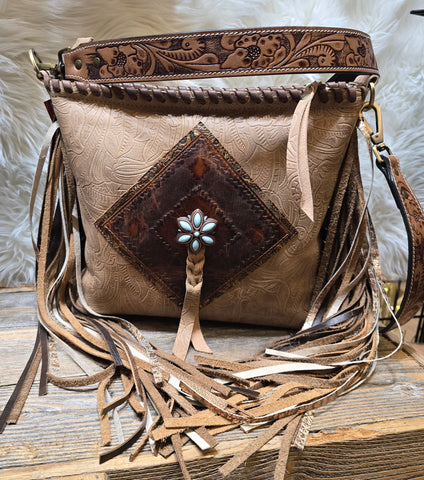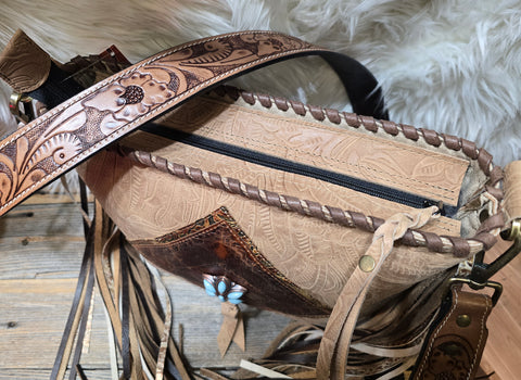 This handcrafted Sally Bag is Western luxury at its finest. Featuring a richly embossed leather front with intricate floral tooling and a striking turquoise-accented concho centerpiece, it’s designed to stand out while staying timeless. The bag is finished with hand-laced detailing, long flowing leather fringe, and a beautifully tooled strap for an elevated cowgirl look.