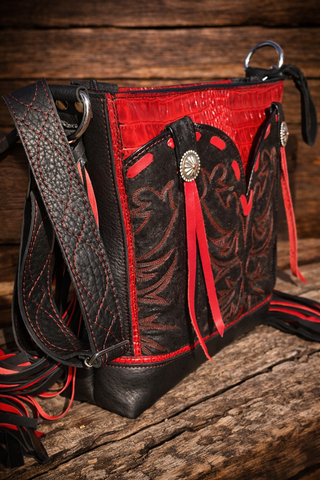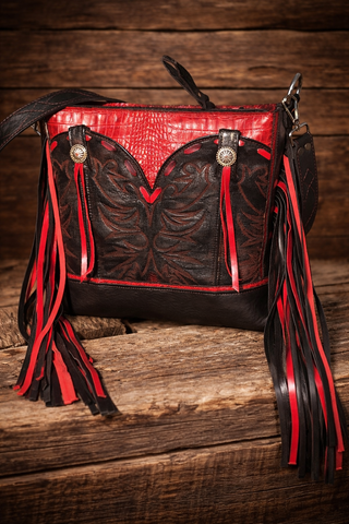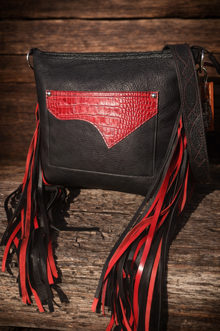 This Sally Bag is Bold, handcrafted, and built for the cowgirl who commands attention. This all-leather purse features a distressed black tooled boot-top that is a full front pocket, striking red croc-embossed leather trim, and silver concho accents. 14" Long layers of red-and-black fringe bring movement and attitude — the perfect mix of Western grit and glam. Made by hand, made to turn heads.