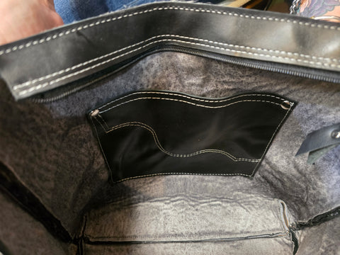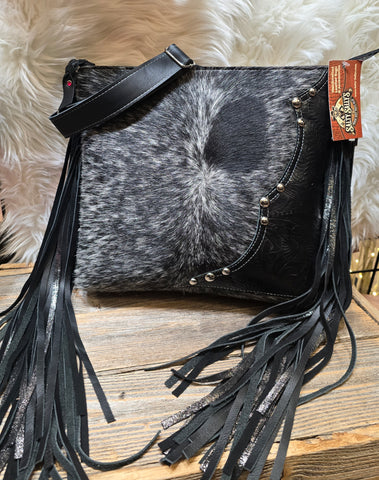This Sally Bag is a striking blend of rugged Western soul and modern edge. Crafted with genuine hair-on-hide, each bag features naturally unique black and silver markings that make it truly one of a kind. The Sally Bag is accented with embossed black cowboy tooled leather trim and polished stud detailing, adding texture and a subtle Western flair.