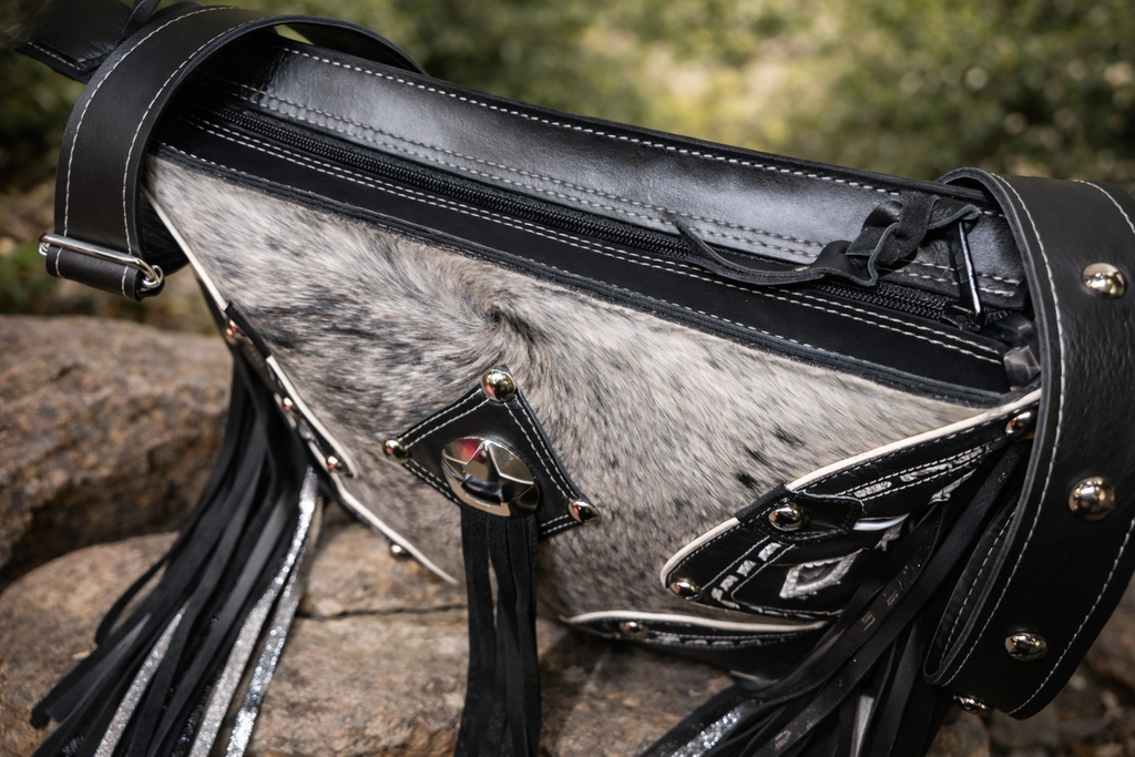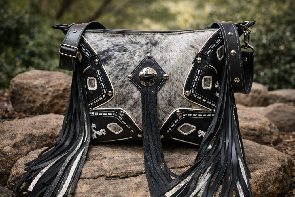Finished with long, flowing leather fringe for bold movement and paired with a handcrafted adjustable studded leather strap, this Sally Bag delivers unmistakable Western elegance with a luxe edge. Confident, timeless, and made to turn heads, it’s the perfect statement piece for rodeos, concerts, and upscale Western events.