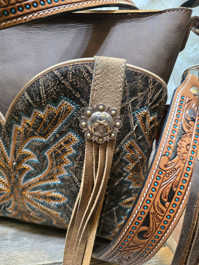 This handcrafted Sally Style boot purse blends classic Western heritage with elevated cowgirl style. Designed from rich, distressed brown leather, it features a dramatic boot-inspired front panel ( full open pocket) with intricate stitched detailing in warm tan and subtle turquoise tones. The curved boot-top is accented with silver conchos and cascading leather fringe for authentic Western flair.🤎