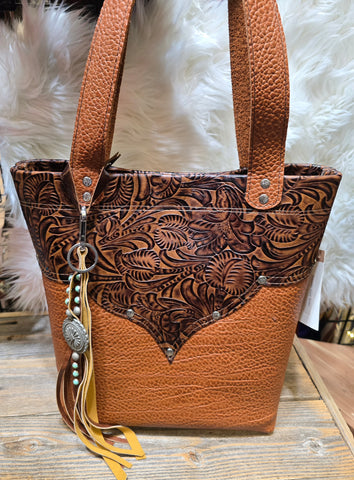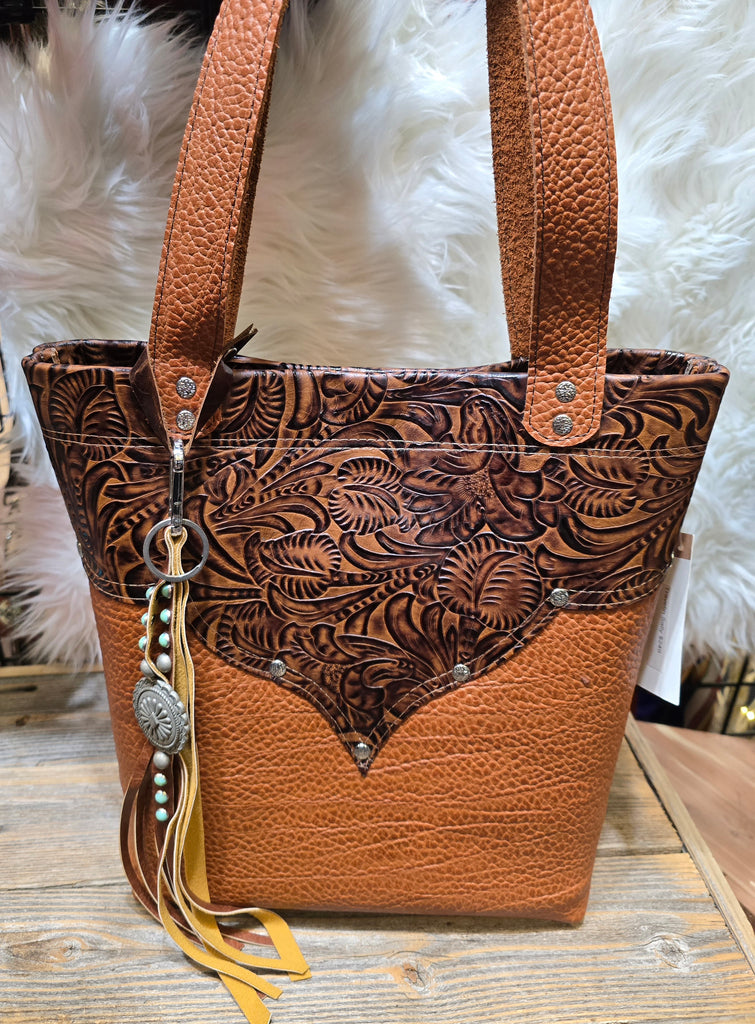 Travelin Sally is a beautifully handcrafted all-leather tote by Salty Sallys in Oklahoma. Featuring deep oak blossom embossed leather paired with dark apricot heavy Italian leather and accented with embossed rivets, this bag blends western elegance with everyday functionality.